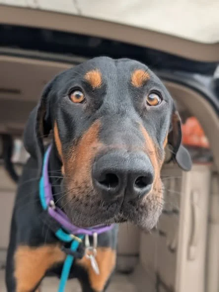Don’t let his sleek, serious looks fool you… this boy is pure sweetness wrapped in a goofy, sensitive soul. Coal is the kind of dog who tries his best to be dignified, but his wiggly butt and soft heart always give him away.